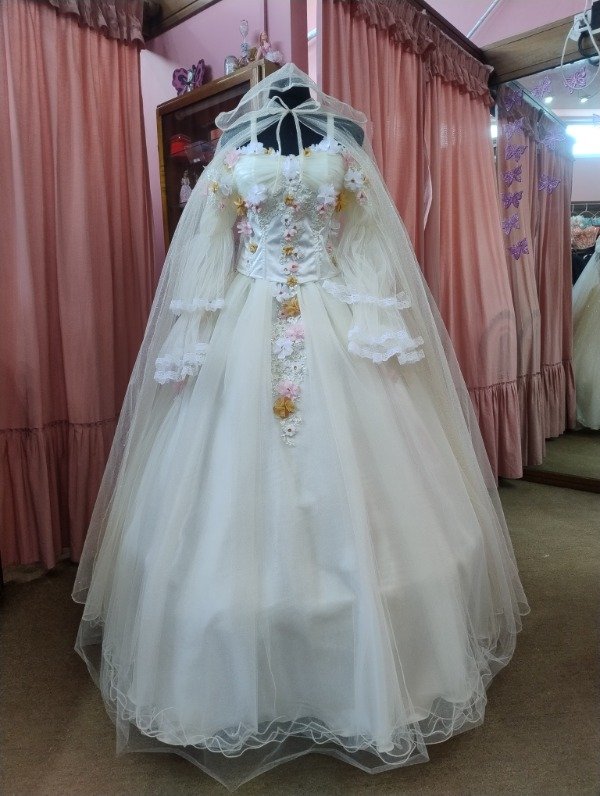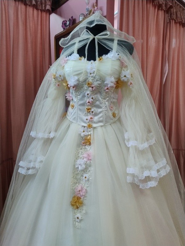 Vestido de 15 Aveline tres piezas, corset emballenado, forrado en saten con encajes aplicados, tambien lleva apliques de mariposas o flores. Faldas de raso y varias capas de tul. Encaje en caída en falda larga. La espalda es ajustable con cinta de raso. Incluye capa de tul con brillo con capucha.
