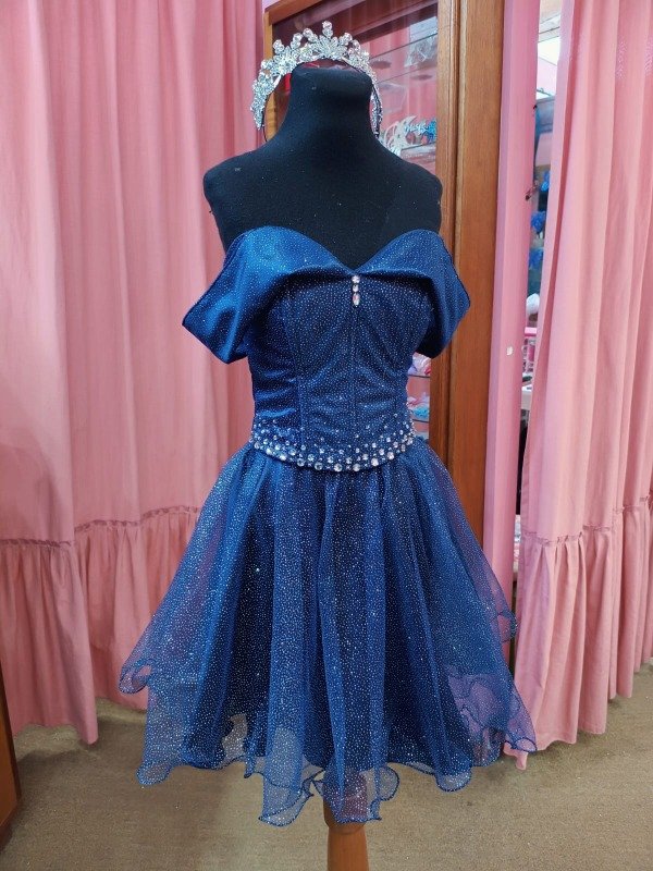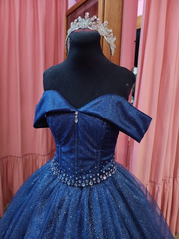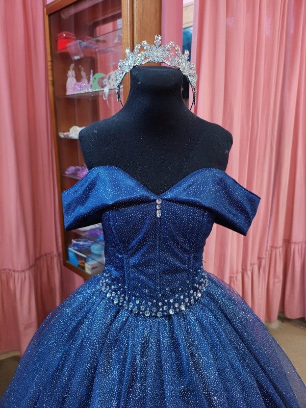 Vestido de 15 Calis con brillo de tres piezas, corset emballenado, forrado en saten, bordado con gemas plateadas importadas. Faldas de raso y una capa de tul con brillo. La espalda es ajustable con cinta de raso.