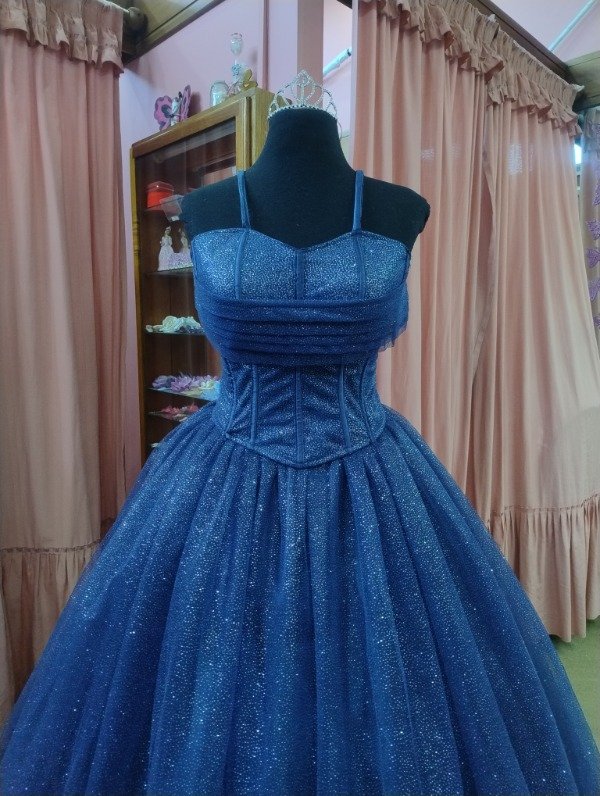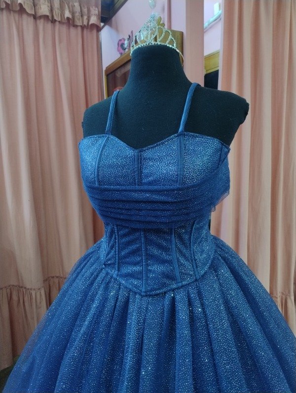 Vestido de 15 Isolienne de tres piezas, corset emballenado, forrado en tul con brillo. Faldas de raso y varias capas de tul. La espalda es ajustable con cinta de raso.