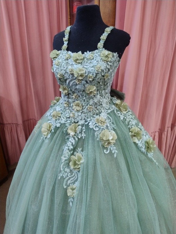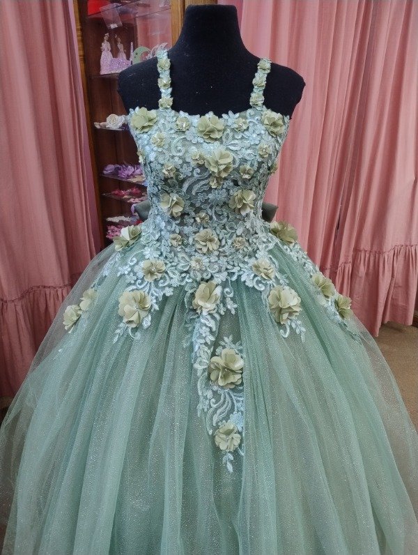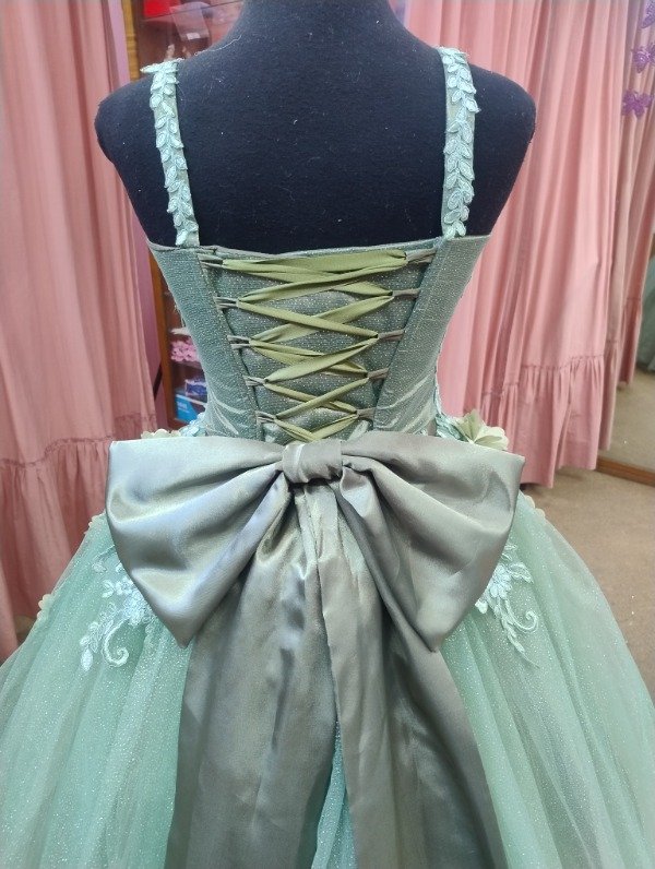 Vestido de 15 Ivéry con brillo de tres piezas, corset emballenado, forrado en encaje, apliques de mariposas o flores. Faldas de raso y varias capas de tul. Encaje en caída en falda larga. La espalda es ajustable con cinta de raso.