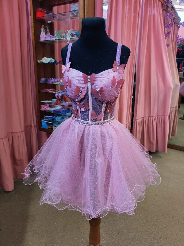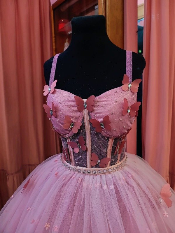 Vestido de 15 Oriane con brillo de tres piezas, bustier emballenado, forrado en encaje, apliques de mariposas o flores. Faldas de raso y varias capas de tul, capa final de encaje. La espalda es ajustable con cinta de raso.